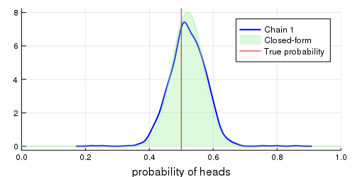 After finishing the sampling process, we can visualize the posterior distribution approximated using Turing against the posterior distribution in closed-form. We can extract the chain data from the sampler using the Chains(chain[:p]) function, exported from the MCMCChain module. Chains(chain[:p]) creates an instance of the Chain type which summarizes the MCMC simulation — the MCMCChain module supports numerous tools for plotting, summarizing, and describing variables of type Chain.