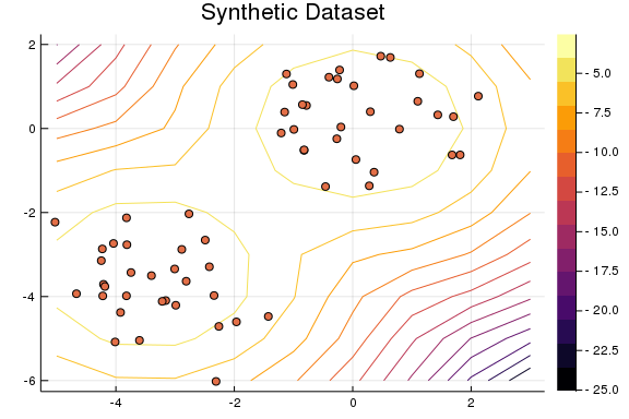 scatter!(x[1,:], x[2,:], legend = false, title = "Synthetic Dataset")