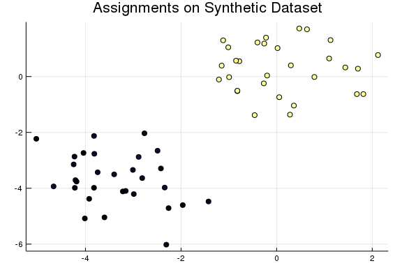 Finally, we can inspect the assignments of the data points infered using Turing. As we can see, the dataset is partitioned into two distinct groups.