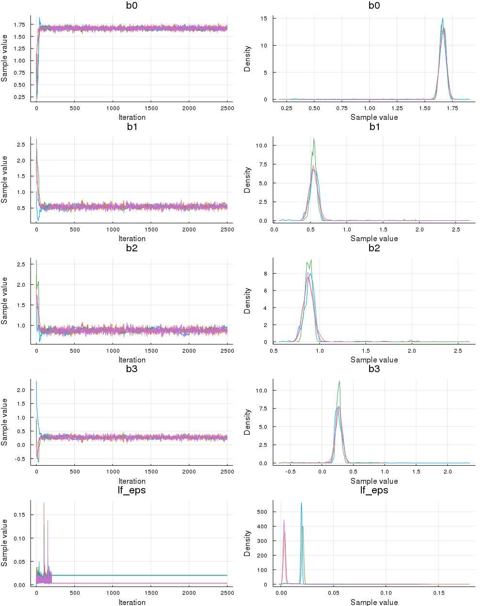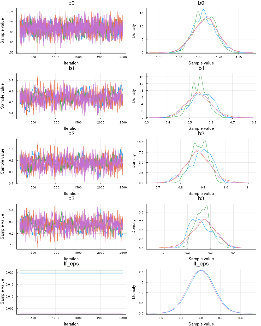 As can be seen from the numeric values and the plots above, the standard deviation values have decreased and all the plotted values are from the estimated posteriors. The exponentiated mean values, with the warmup samples removed, have not changed by much and they are still in accordance with their intuitive meanings as described earlier.
